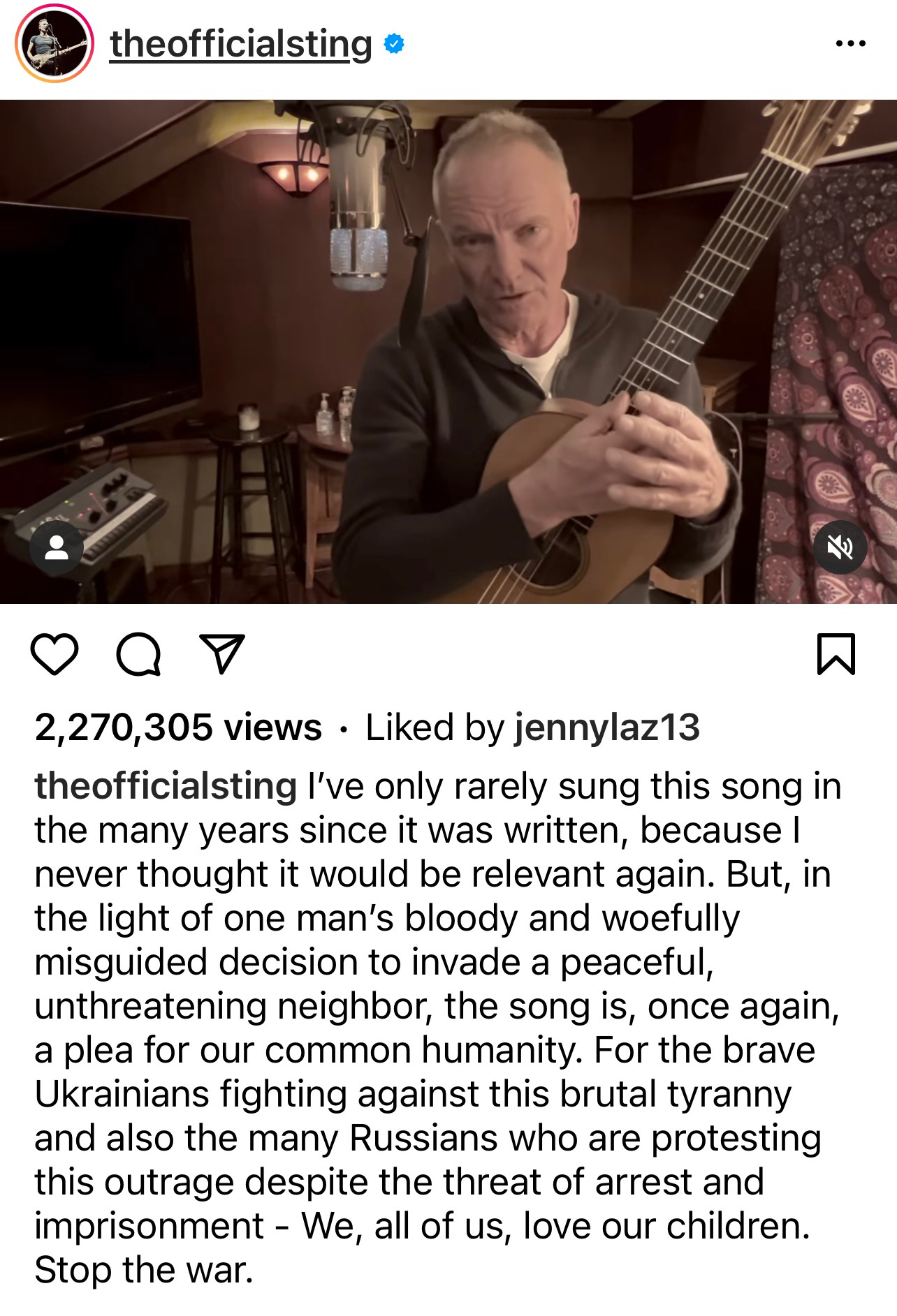 This month, Sting played the song again. “I’ve only rarely sung this song in the many years since it was written, because I never thought it would be relevant again. But, in the light of one man’s bloody and woefully misguided decision to invade a peaceful, unthreatening neighbor, the song is, once again, a plea for our common humanity.”