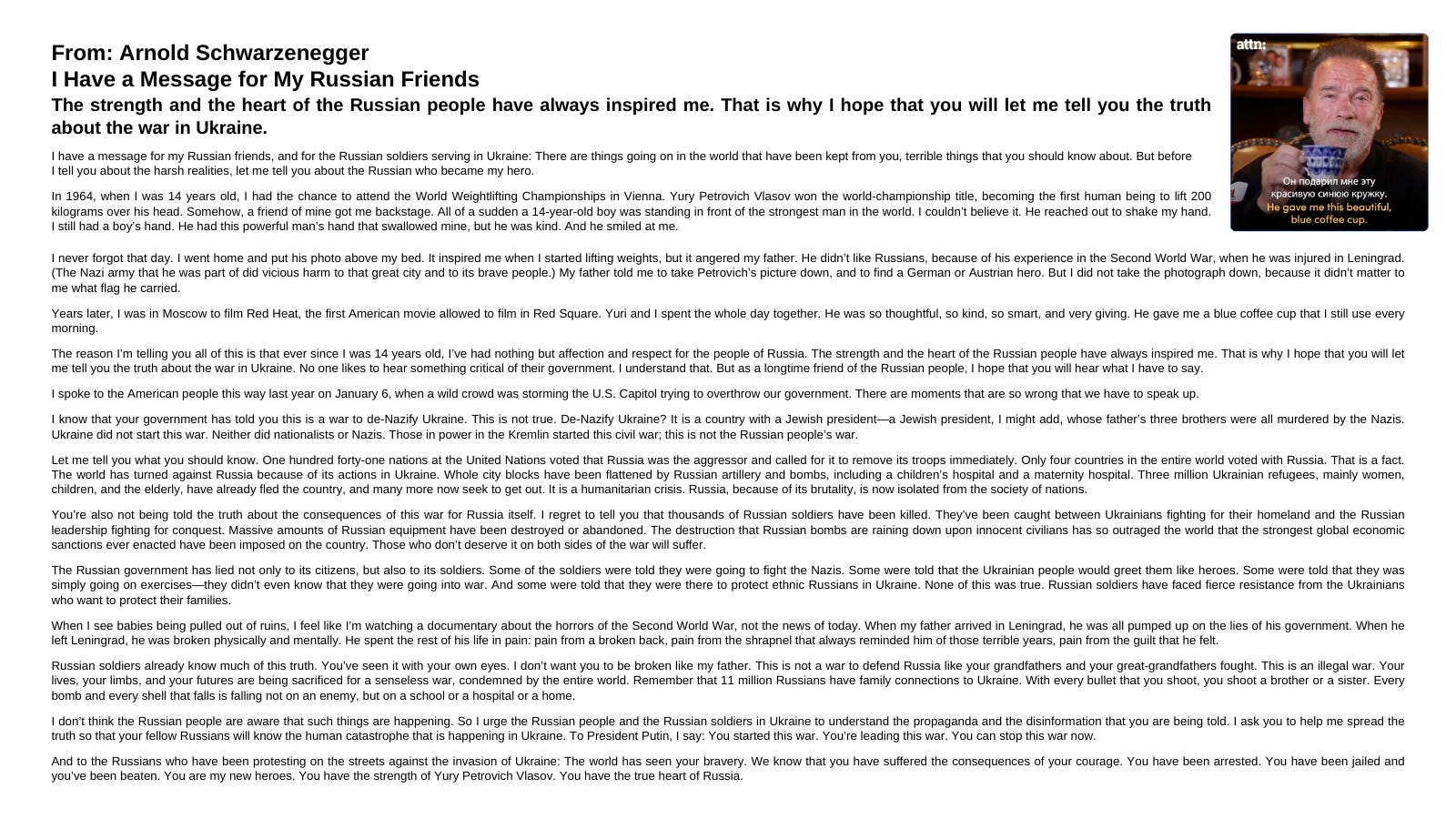 This video will be a part of the legendary artifacts of this war. This is as genuine as any speech I’ve ever seen. With his influence in the muscle-bound and macho world of military people the world over, he just might be able to pierce Putin’s new “digital iron curtain” (a phrase I learned on Jake Tapper’s CNN show today, as he interviewed journalists and Russia experts Masha Gessen and David Remnick, a segment that started with a discussion of Schwarzenegger’s video).