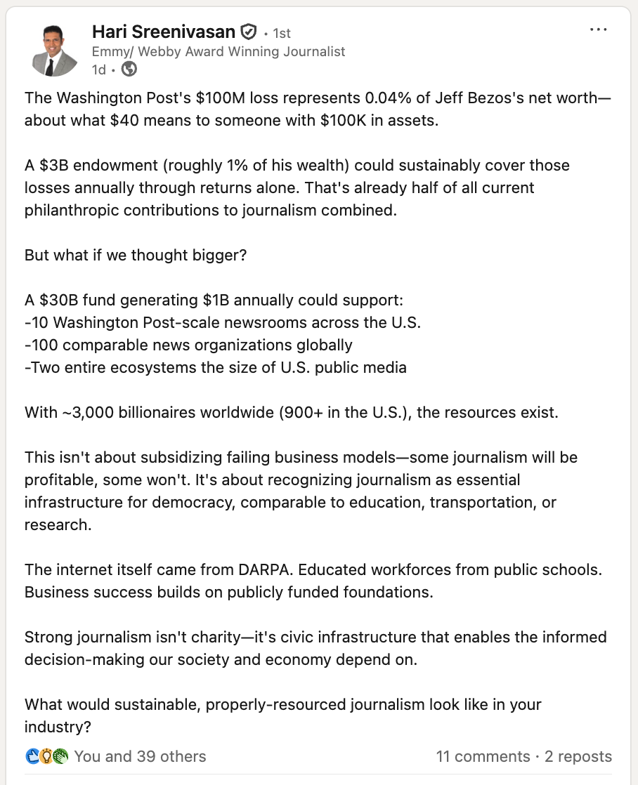 This erosion of a key lever of accountability is a feature, not a bug. Oliver Darcy reports that a group of D.C. financiers had offered to, at least, buy the local and sports sections from The Post and run them independently or as a joint venture, but received no answer. Kara Swisher has been kicking the tires on the Post since at least 2024, but that has amounted to nothing as well.