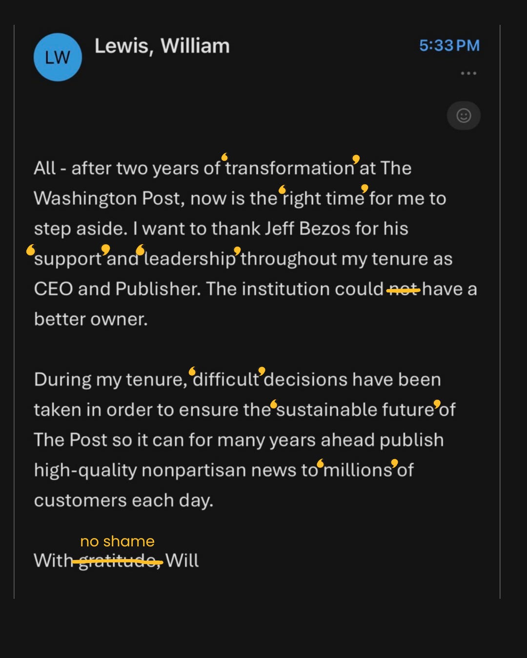 I don’t think we need to mine the depths of human knowledge to find motive here. Owning an adversarial news outlet is at odds with Bezos’ core mission of accumulating money and power. This bit from 404 Media’s Jason Koebler, whose father worked at a Post printing center, captures it really well: