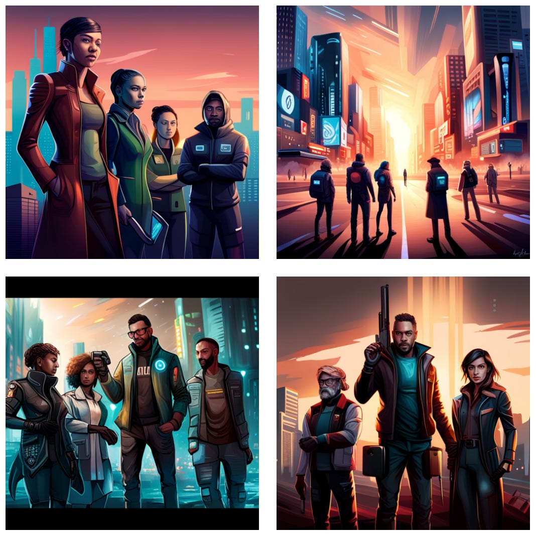 Sree’s newsletter is produced with Zach Peterson (@zachprague). Digimentors Tech Tip from Robert S. Anthony (@newyorkbob). Our sponsorship kit. The images above were generated on Jasper.ai using the following enhanced prompt: “Create a cyberpunk digital painting that depicts a group of people from diverse backgrounds working together to protect the planet from the threat of AI. The style should be dramatic and impactful.”